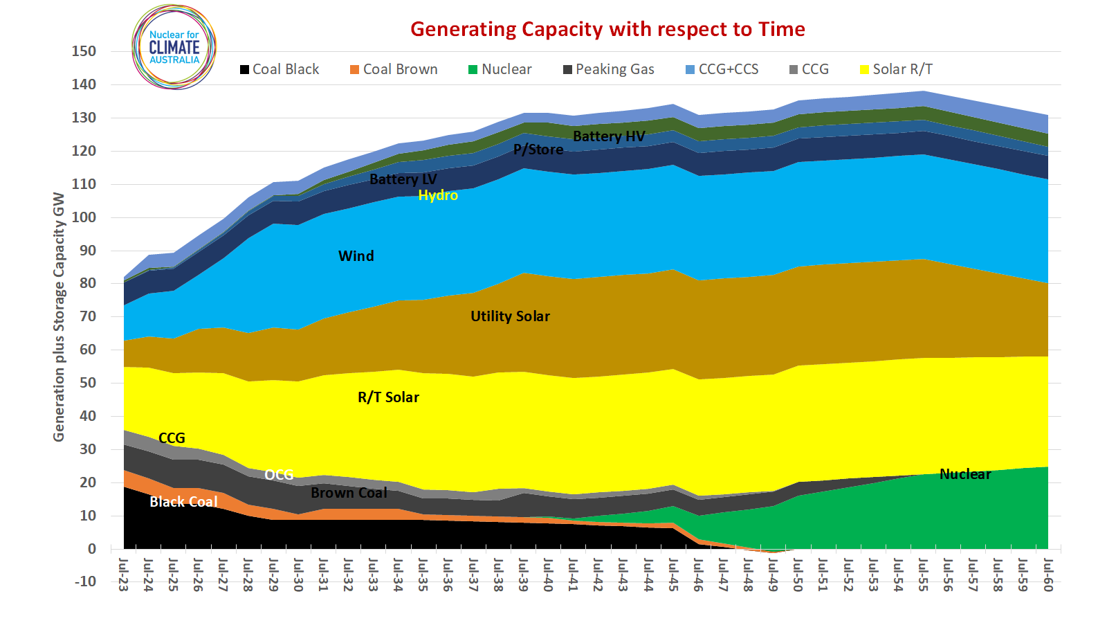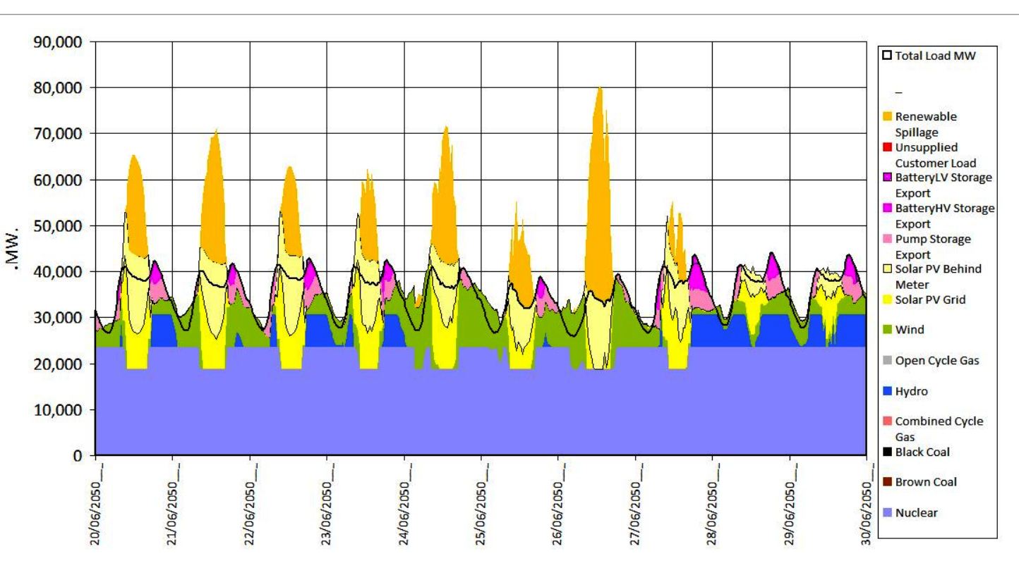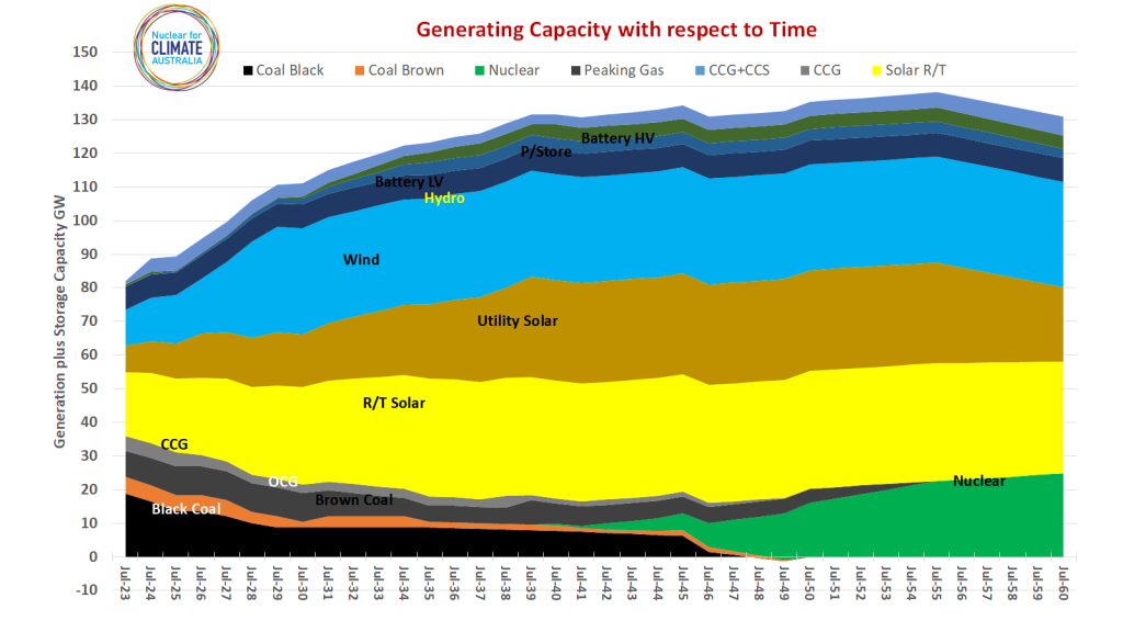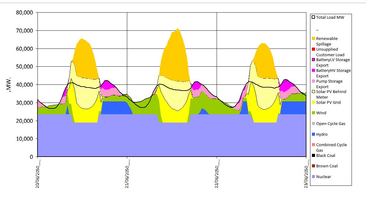 The nuclear generation curve is taken from the Nuclear for Climate’s RP6 Energy plan with first nuclear energy being produced from a 300MW small nuclear plant likely located in South Australia. Note that this analysis applies only to the National Electricity Market (NEM) and does not include the Western Australia SWIS or any other Western Australian loads.