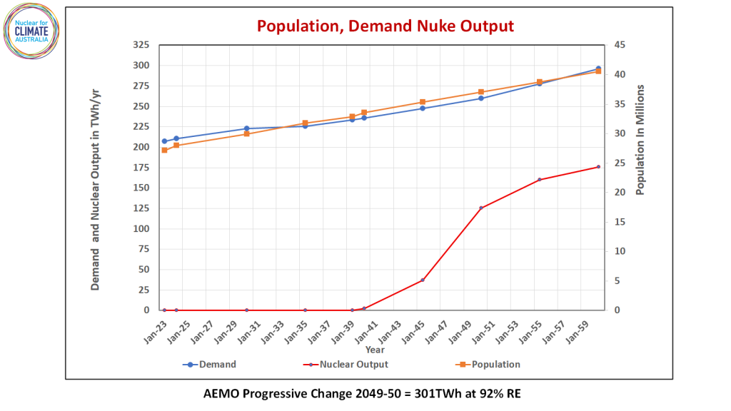 In the following Figure 1 we compare population growth with electricity demand and the growth in nuclear energy from our modelling. This shows the first nuclear energy to be available after 2039. Load and population match each other and the population growth is taken from the Australian Bureau of Statistics.