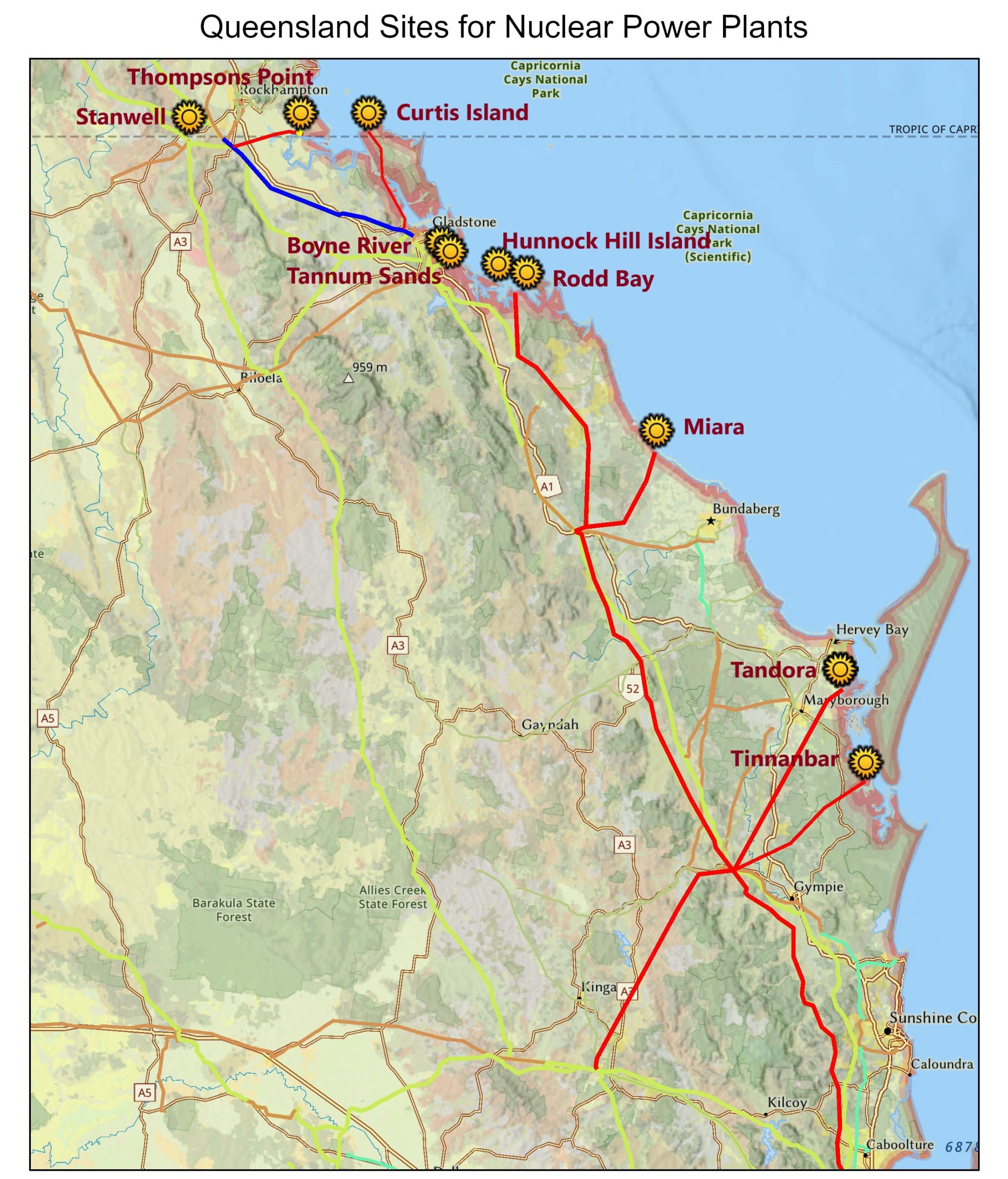 Figure 1 Potential Sites for Large Nuclear Power Plants in QLD shown in yellow icons